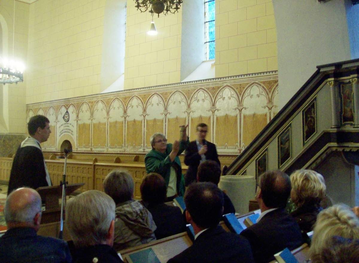 In seinem kurzen Bericht vor der Andacht würdigte er die großzügige finanzielle Unterstützung durch die Badische Landeskirche seit Anbeginn der Erneuerungsarbeiten, ebenso auch die der Sparkassen-Stiftung, des Landkreises Uckermark, der Stadt Lychen und die Spendenbereitschaft vieler Bürger. Mit großer Freude stellte Henryk Wichmann uns Teilnehmern des Festaktes die Handwerker und Mitarbeiter vor, die sich mit ihrer Arbeit besonderes Lob verdient haben: Magda und Mateusz, welche die Wandgemälde freigelegt haben; Marco Zibell, den talentierten Maler an der Empore und ganz besonders Tischlermeister Horst Jähnke, der die fehlenden Pyramiden und 39 Holzteile über den Säulen neu gefertigt hat; Uwe Böttcher und Mitarbeiter, die den Jerusalem-Radleuchter wiederhergestellt haben.