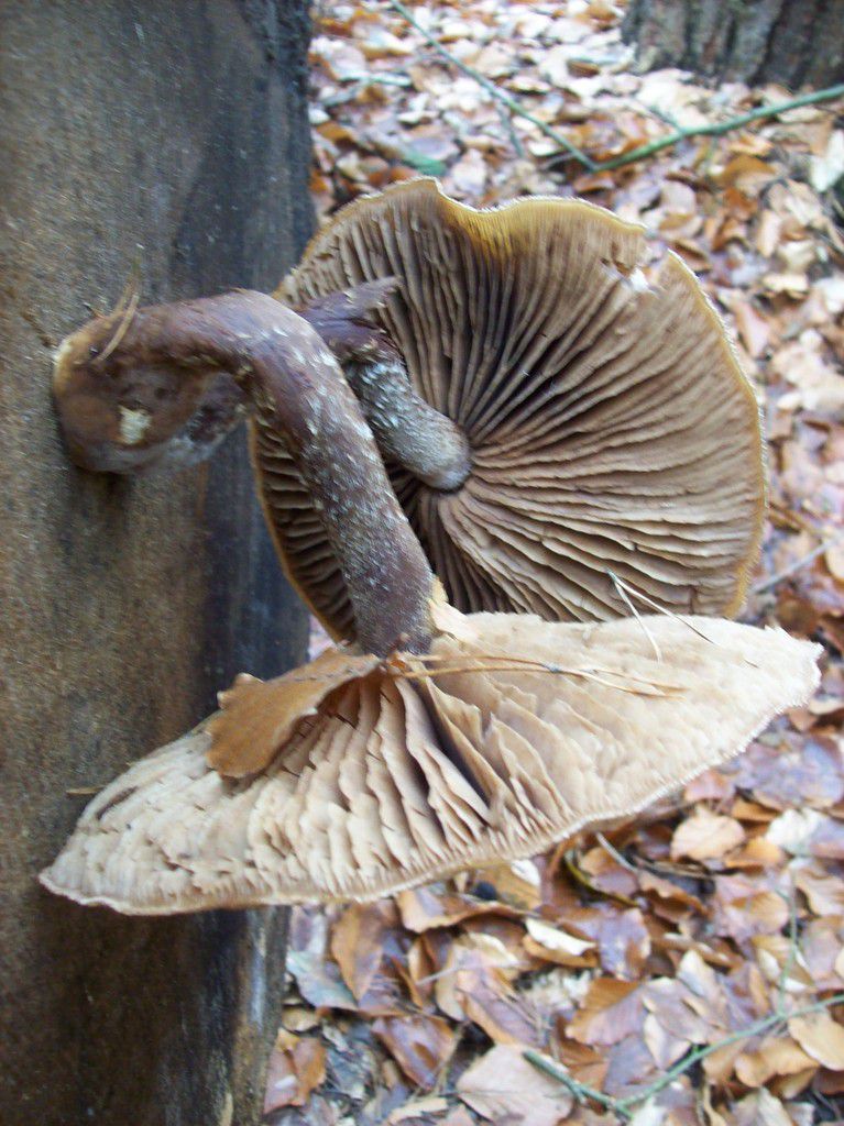Auf meiner Herbstwanderung mit dem Fahrrad durch unsere Buchenwälder vor einigen Tagen kam ich an einen Waldweg, an dem abgeholzte, große, dicke Eichenstämme lagen. Als ich näher an die Schnittstellen herankam, erblickte ich Pilze, die ich zuvor noch nie in unseren Wäldern gefunden hatte. Ich war erstaunt und verwundert zugleich. Der Pilz sah sehr schön aus. Auf dem leuchtend braunem Hut lagen kleine weiße Flecken wie frische Schneeflocken. Den Hutrand zierte ein weißer Ring. Kräftig waren die Stiele an den jungen Exemplaren, manchmal verdickt und etwas schuppig. Unter den alten, ausgewachsenen Pilzen hatten manche Hüte mit einer Spannweite von ca 15 cm.